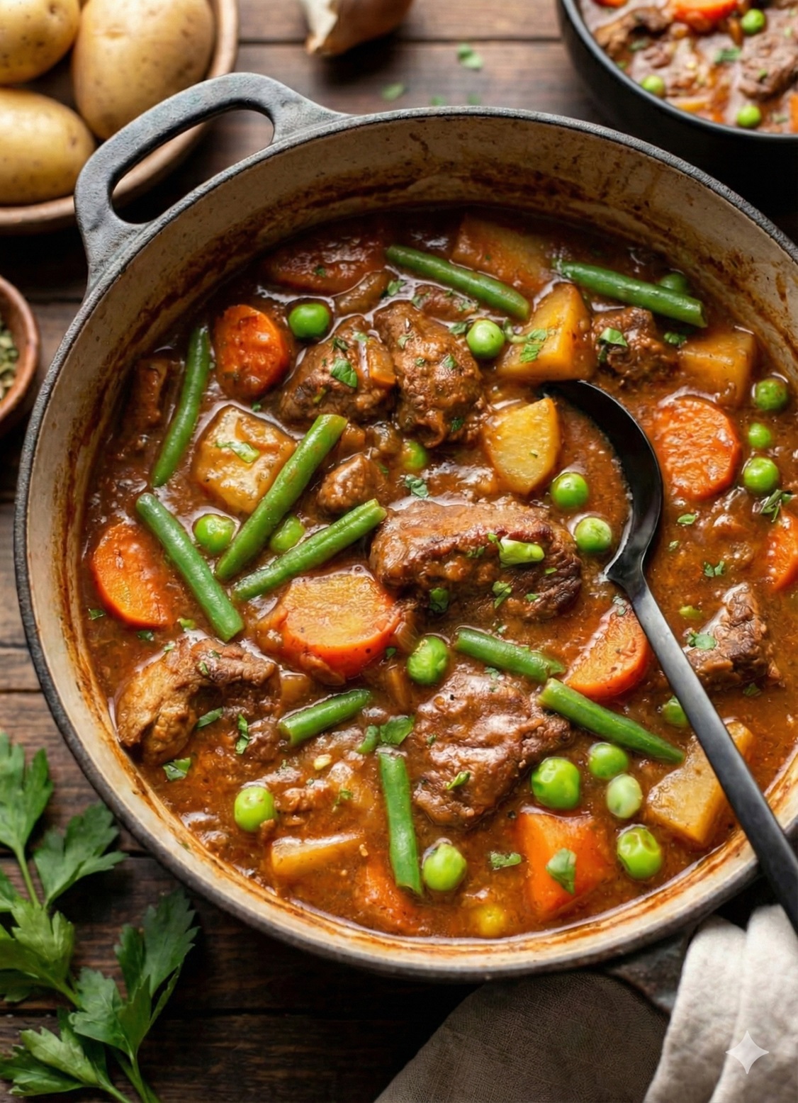Served alongside buttery roasted garlic potatoes and gently sautéed green beans.