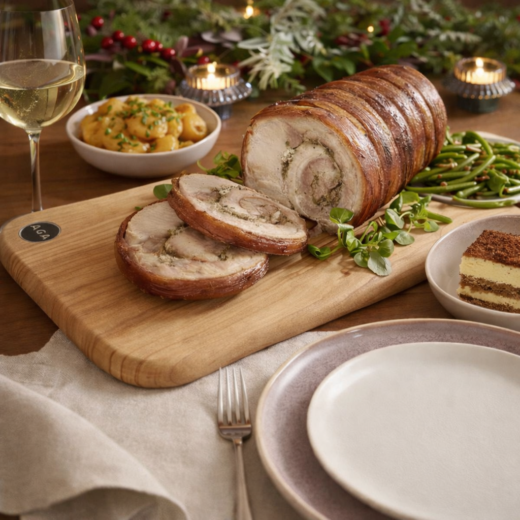 At the centre of the table, a 2.4–3kg roast porchetta — pork belly carefully rolled around tender pork loin, infused with aromatic herbs and traditional seasoning, then slow-roasted until meltingly succulent with a beautifully crisp exterior. A dish that captures the spirit of rustic Italian hilltop villages, where time slows and meals are meant to be shared.