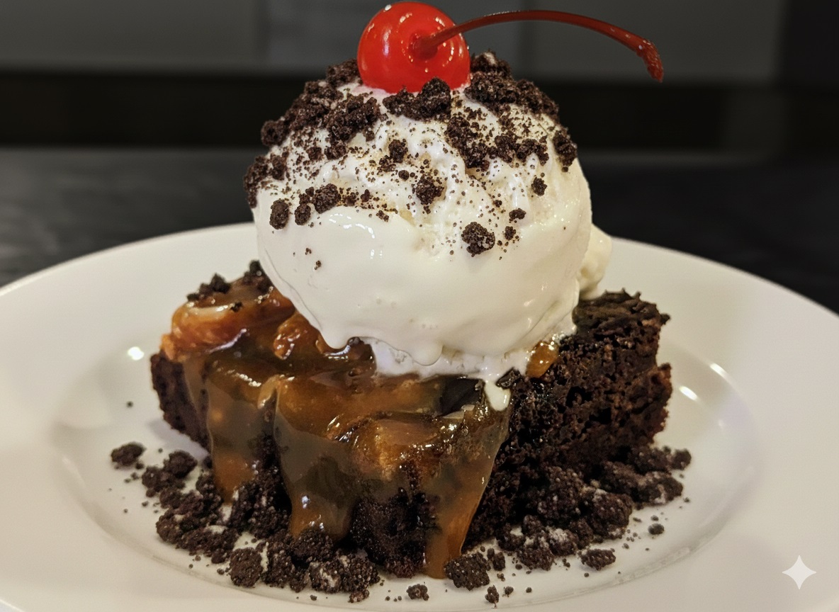 A decadent blend of milk, dark, and semi-sweet chocolates mixed with thick, gooey homemade caramel, French sea salt, and oven-roasted California walnuts. Finished with rich chocolate swirls, This dessert is pure indulgence.