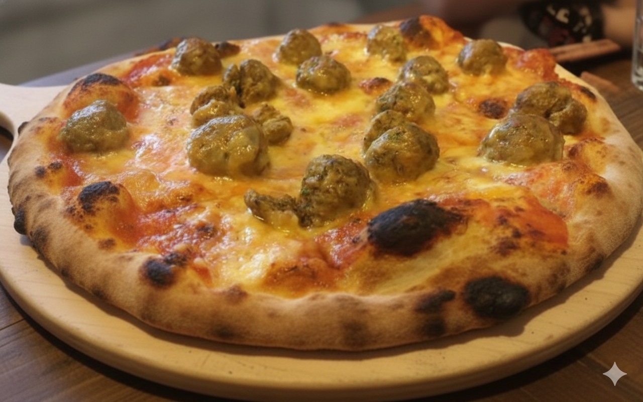 Our Homemade Pork Meatballs Stuffed with Cheddar Cheese, Italian Herbs and Chili Flakes on a Cheddar Cheese Pizza