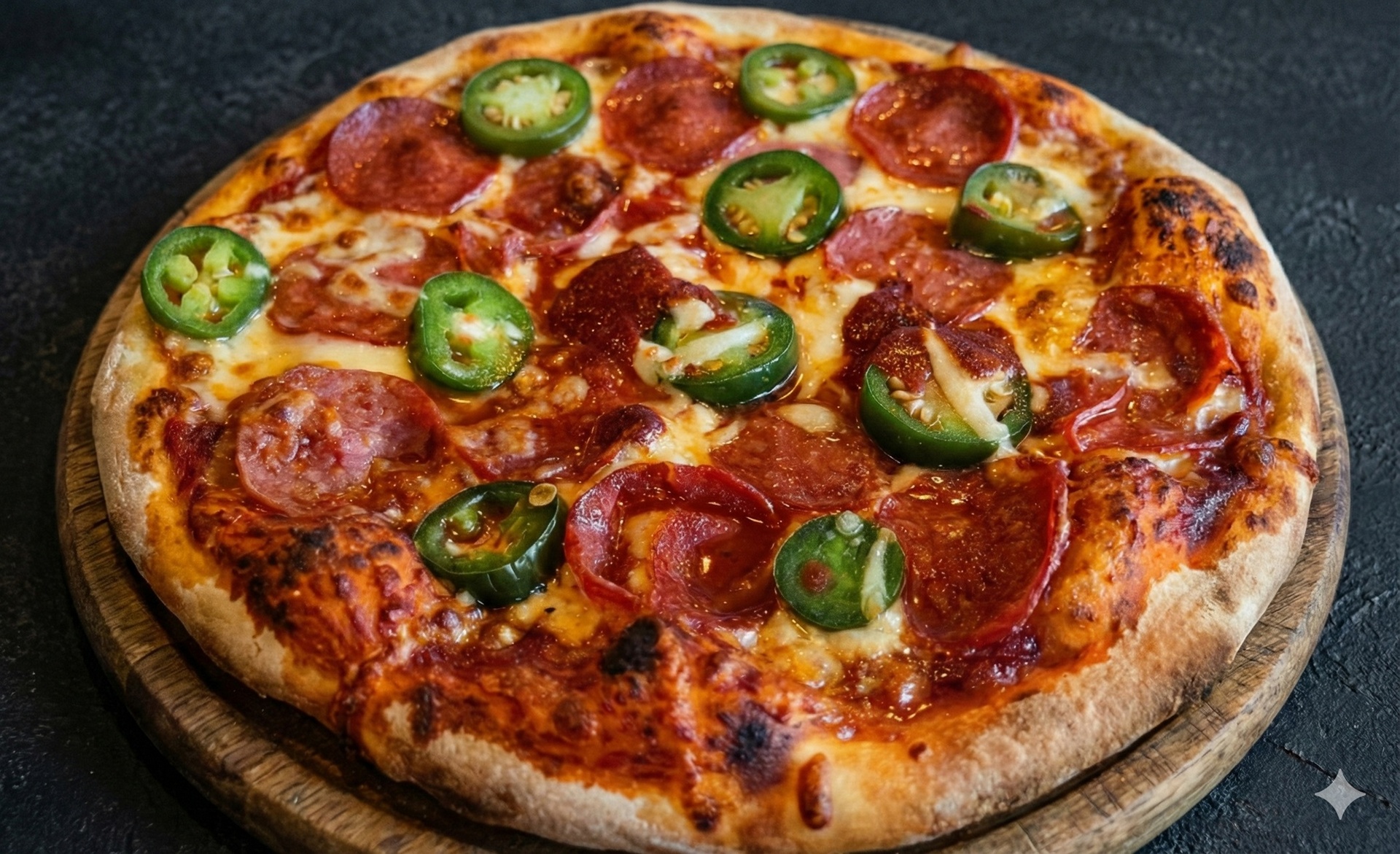 Beef Pepperoni with Fresh Sliced Spicy Jalaapeno Peppers. You can change it to Chicken Pepperoni if you want.