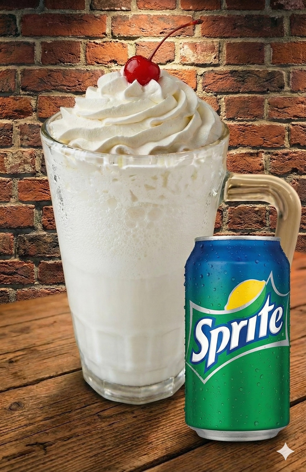 A refreshing, lemon-lime twist on a favorite. Featuring two generous scoops of local vanilla ice cream and a crisp can of Sprite. Topped with rich, velvety Debic whipped dairy cream for a smooth, citrusy treat.