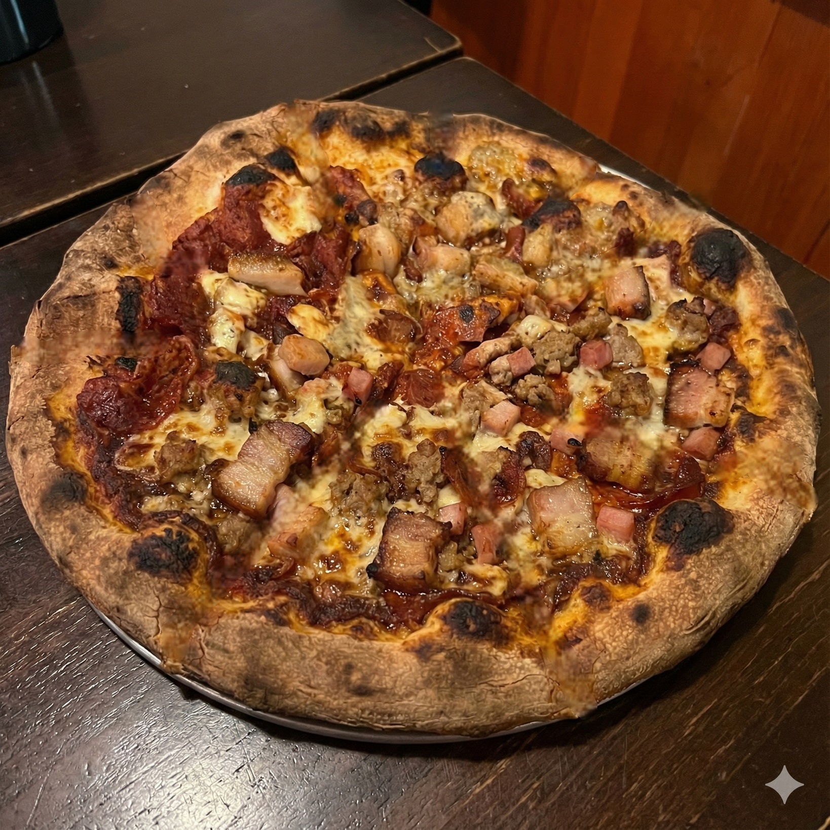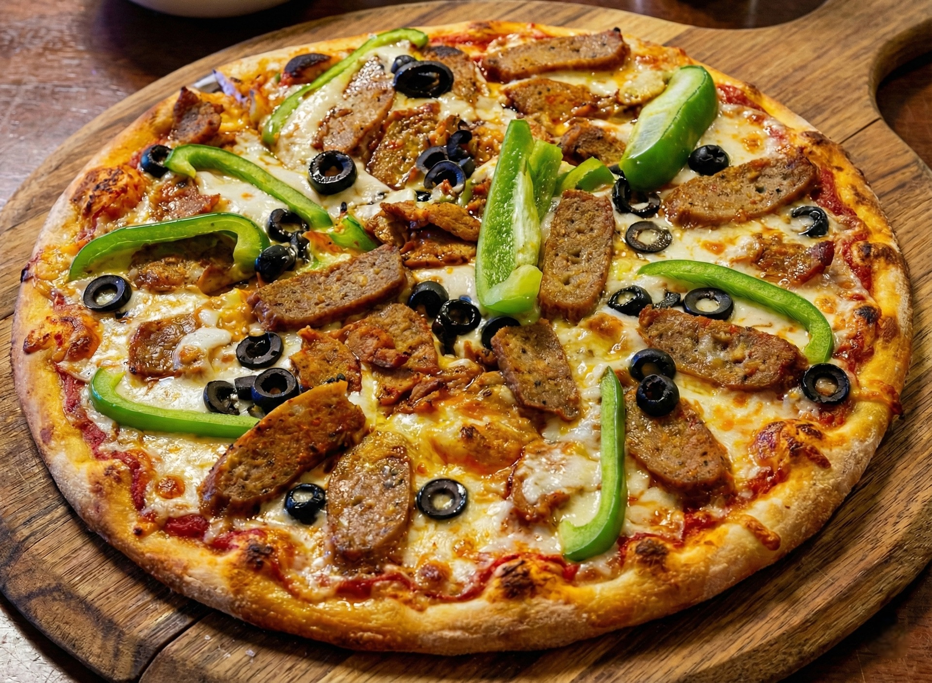 Homemade Italian Pork Sausage, Pork Bacon Chips, Fresh Sliced Green Capsicums, Black Olives, Sliced Sweet Onions and Parmesan Cheese RM 61.90
